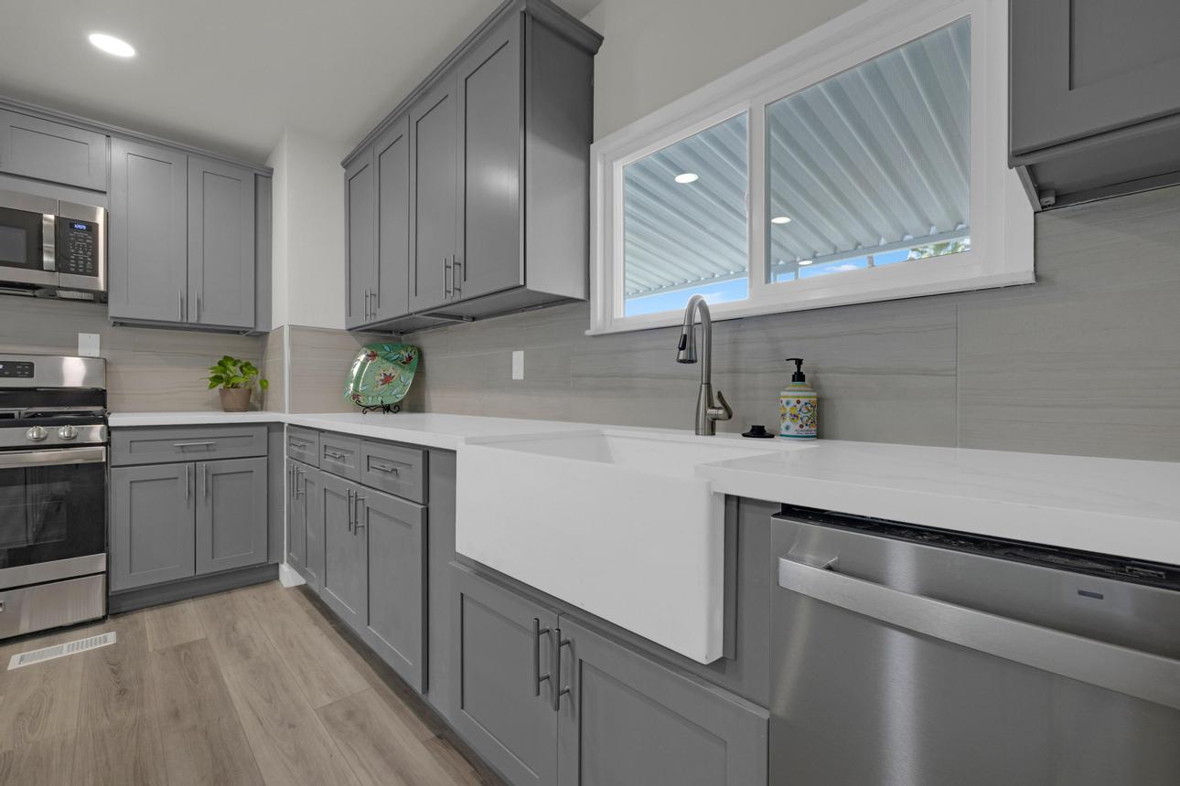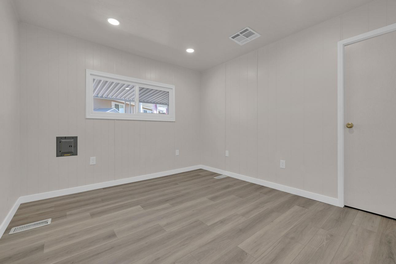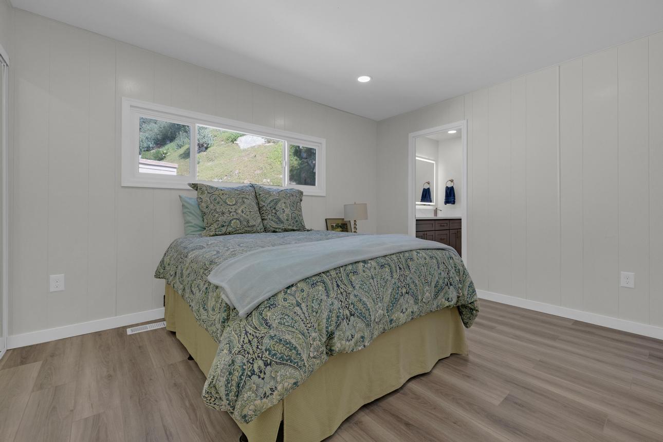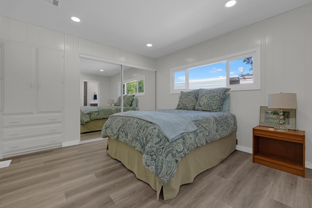 Gorgeous Remodel! Large lot that sits against a hillside with EZ care landscaping. New windows, kitchen and baths. Real wood cabinets, quartz counter tops, tiled back splash, new GE appliances and recessed lighting through out. Most of the rooms have been drywalled. The primary bedroom has a mirrored closet, and private bath with a step-in shower. The family room features a built-in electric fireplace. Too pretty to describe, must see the pictures on our website or in person! Large deck and even larger, very private back yard with room for a Bocce ball court, garden or nothing a all. Call today, you won’t want to miss this one. Located in a highly sought after 55+ community in Santee. (ABD8027)