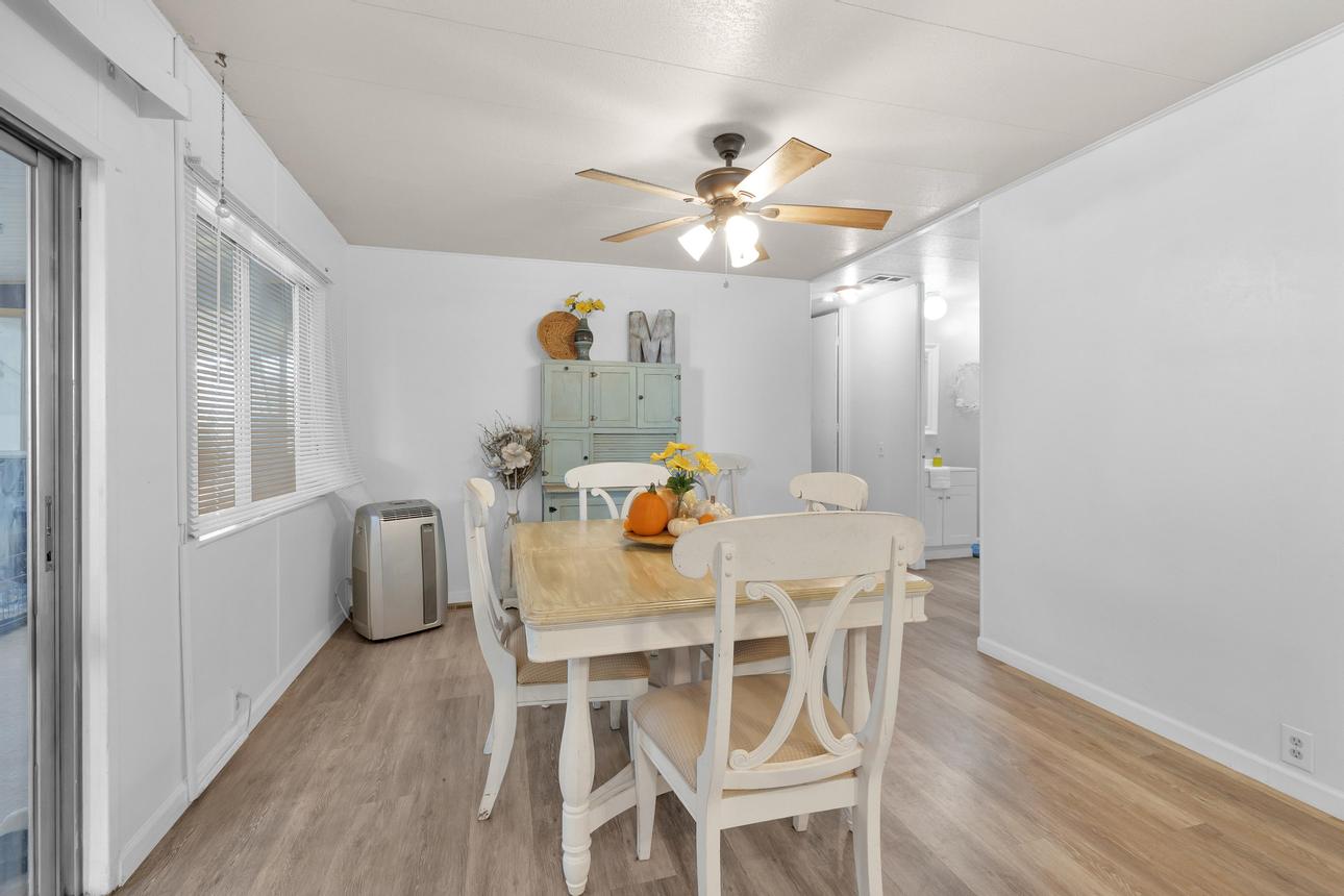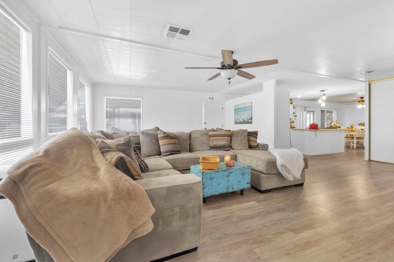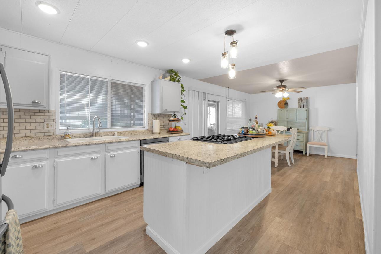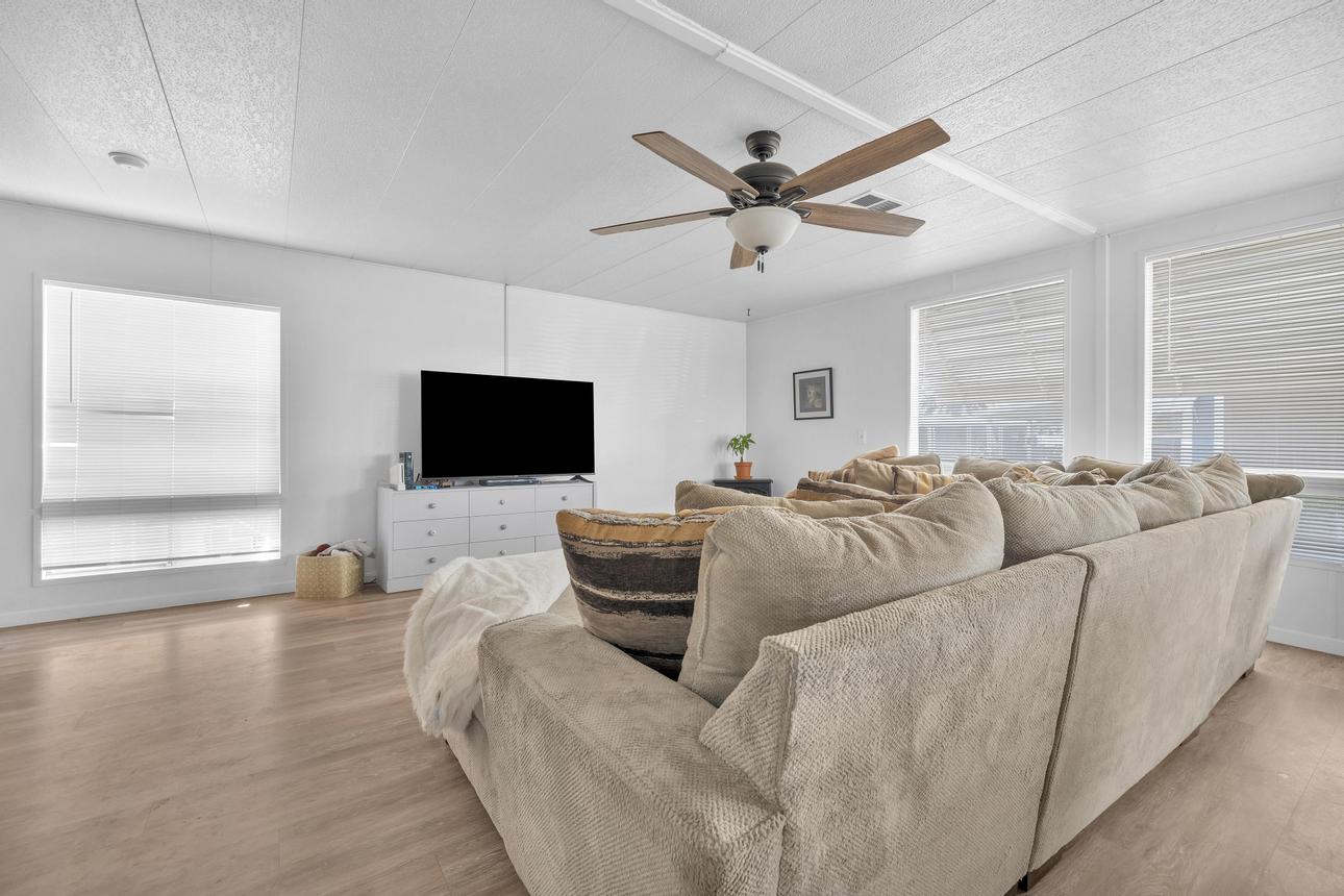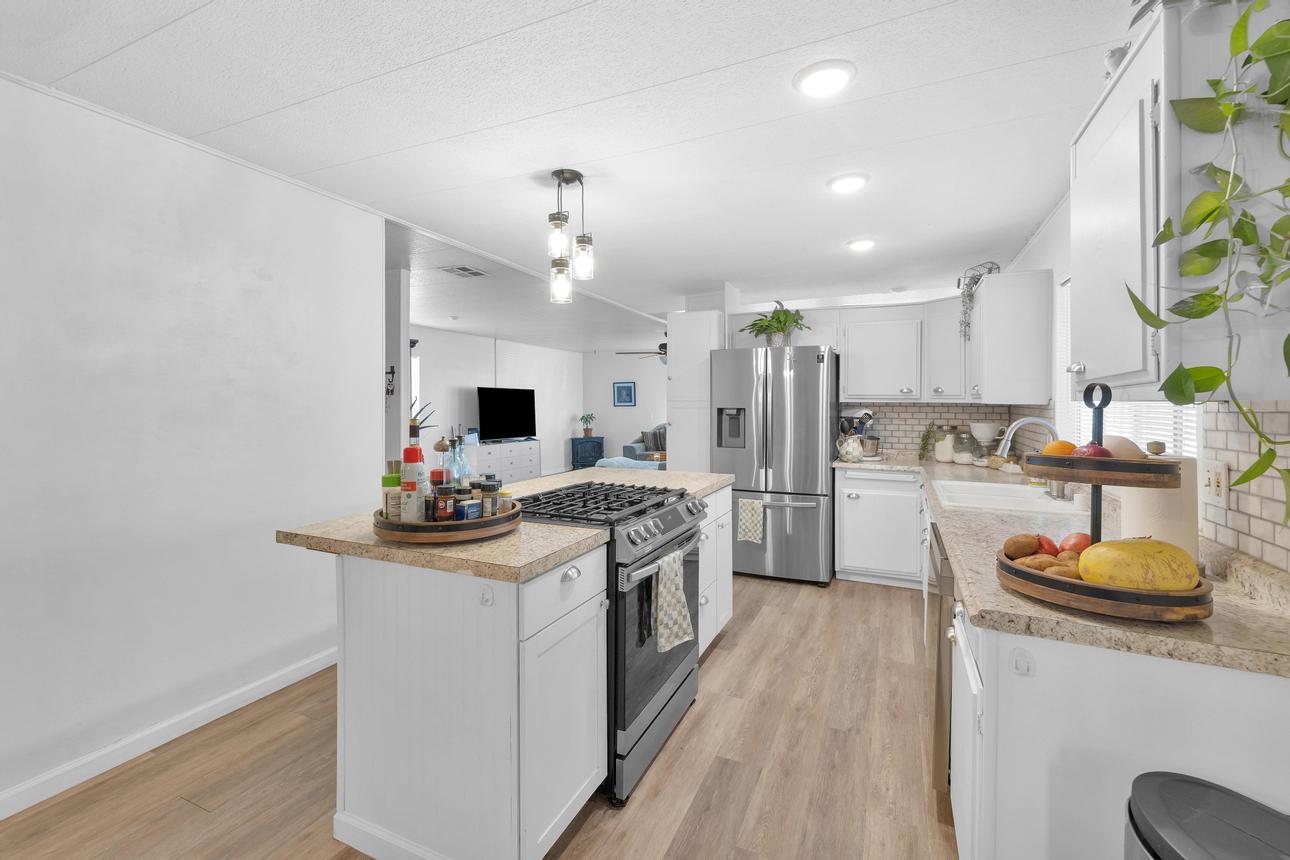 Beautifully upgraded, open concept, roomy 2 BR, 2 BA home. Newer vinyl plank flooring throughout. Upgraded bathrooms with newer vanities, newer shower enclosure in the primary and a newer shower/tub in the guest bath. Large kitchen island, dishwasher, air fry oven and stove combo. Plenty of storage and counter space. The home also has a Calif. room, a utility room and a storage shed. Carport holds three cars, and best of all, No Property Tax, home is on annual registration. Located in a quiet, clean and gated 55+ community. Call today to see for yourself! (AAC6887)