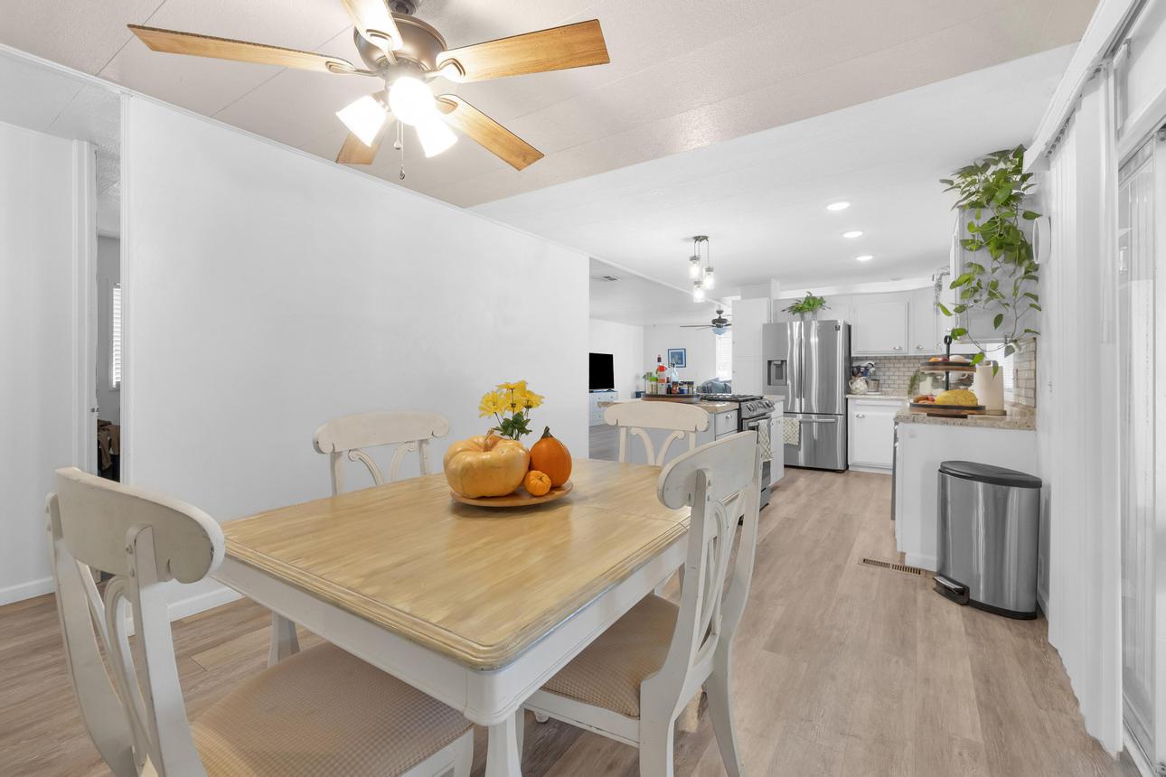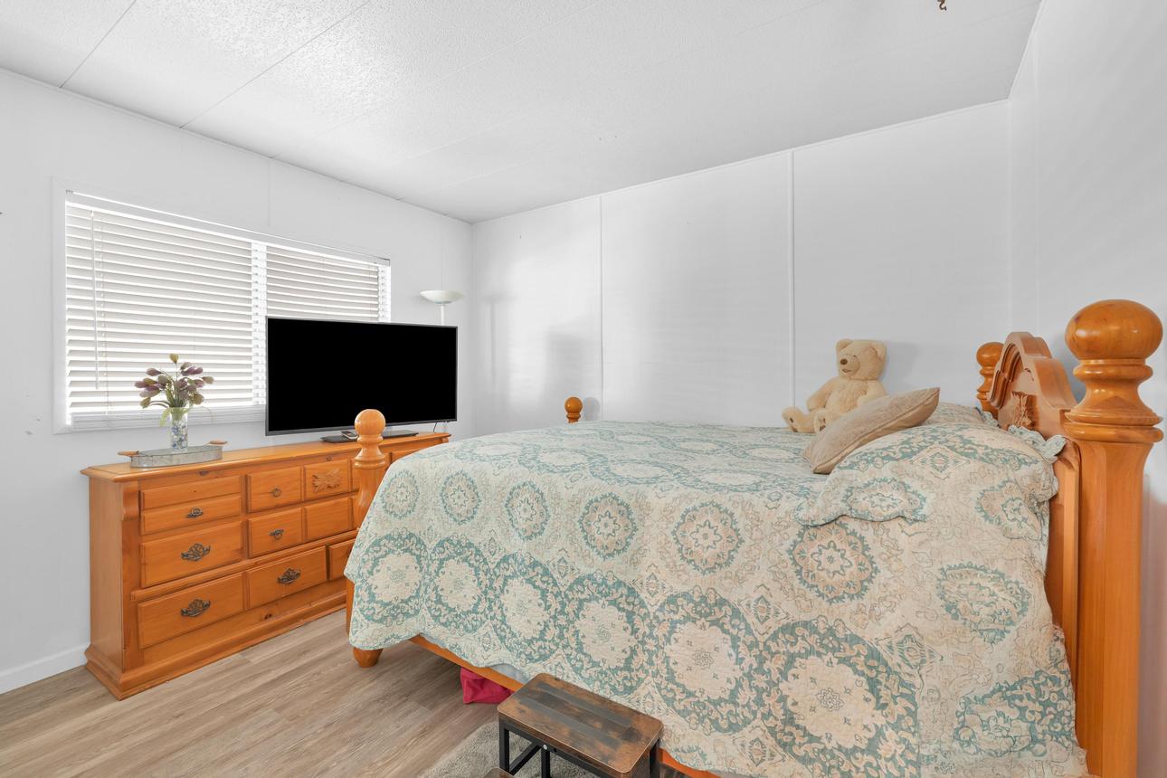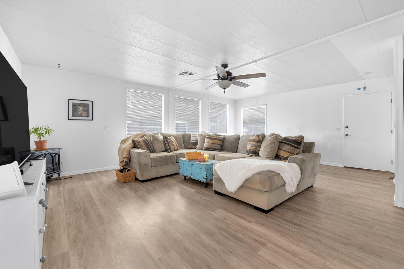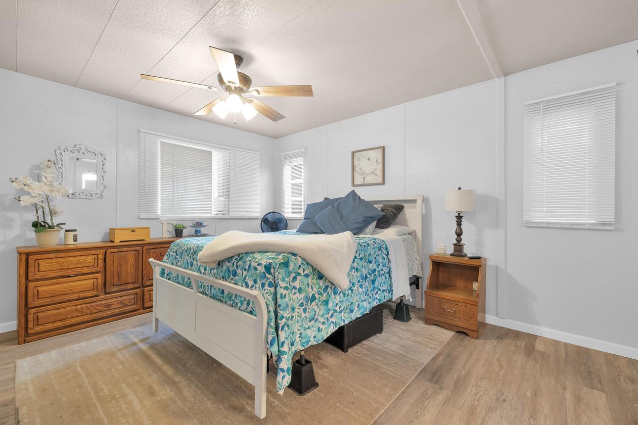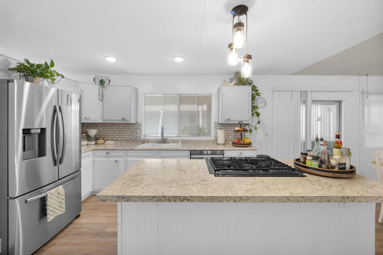 Beautifully upgraded, open concept, roomy 2 BR, 2 BA home. Newer vinyl plank flooring throughout. Upgraded bathrooms with newer vanities, newer shower enclosure in the primary and a newer shower/tub in the guest bath. Large kitchen island, dishwasher, air fry oven and stove combo. Plenty of storage and counter space. The home also has a Calif. room, a utility room and a storage shed. Carport holds three cars, and best of all, No Property Tax, home is on annual registration. Located in a quiet, clean and gated 55+ community. Call today to see for yourself! (AAC6887)