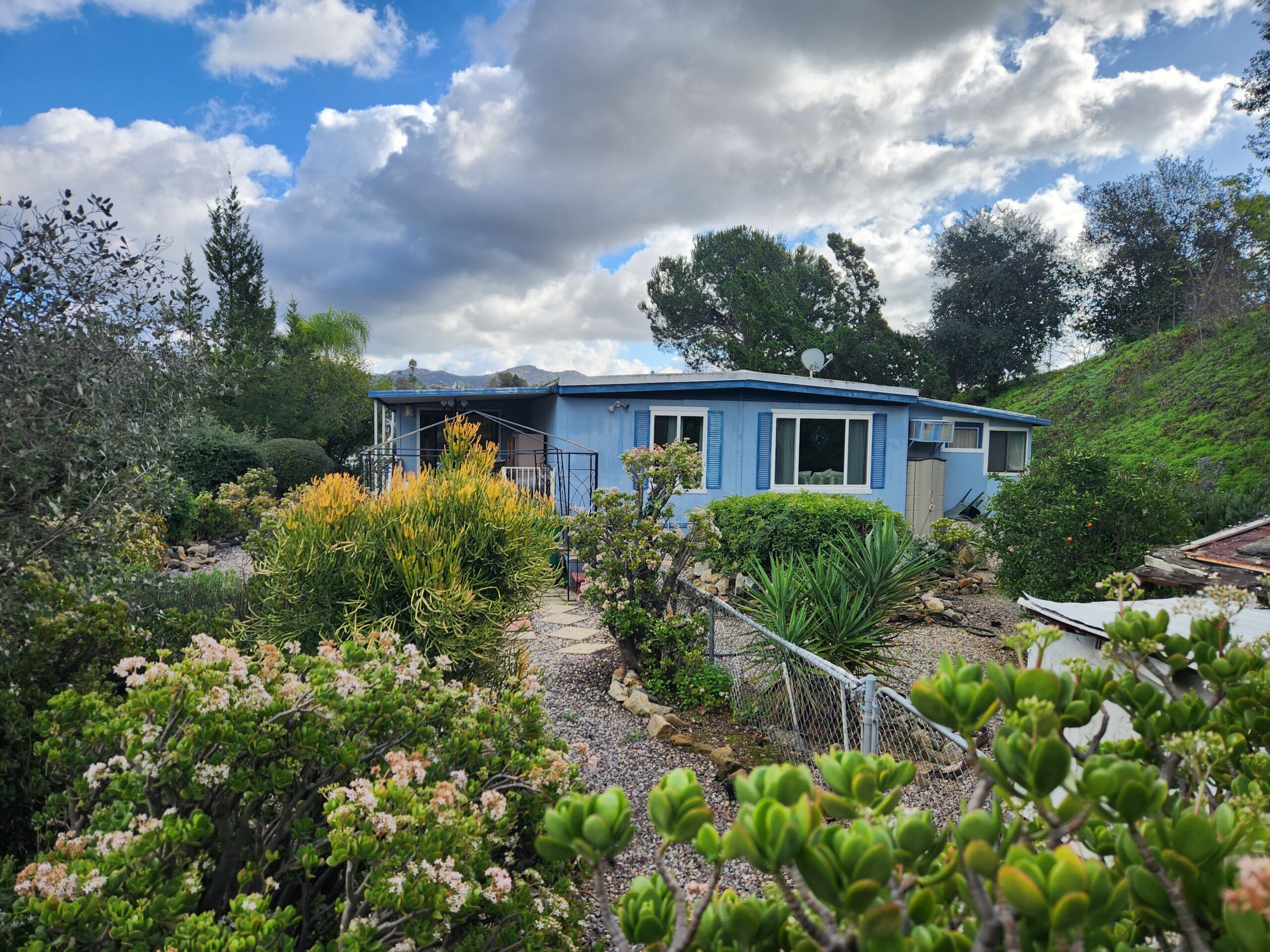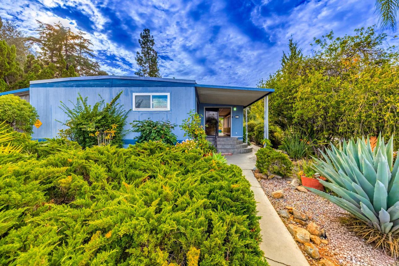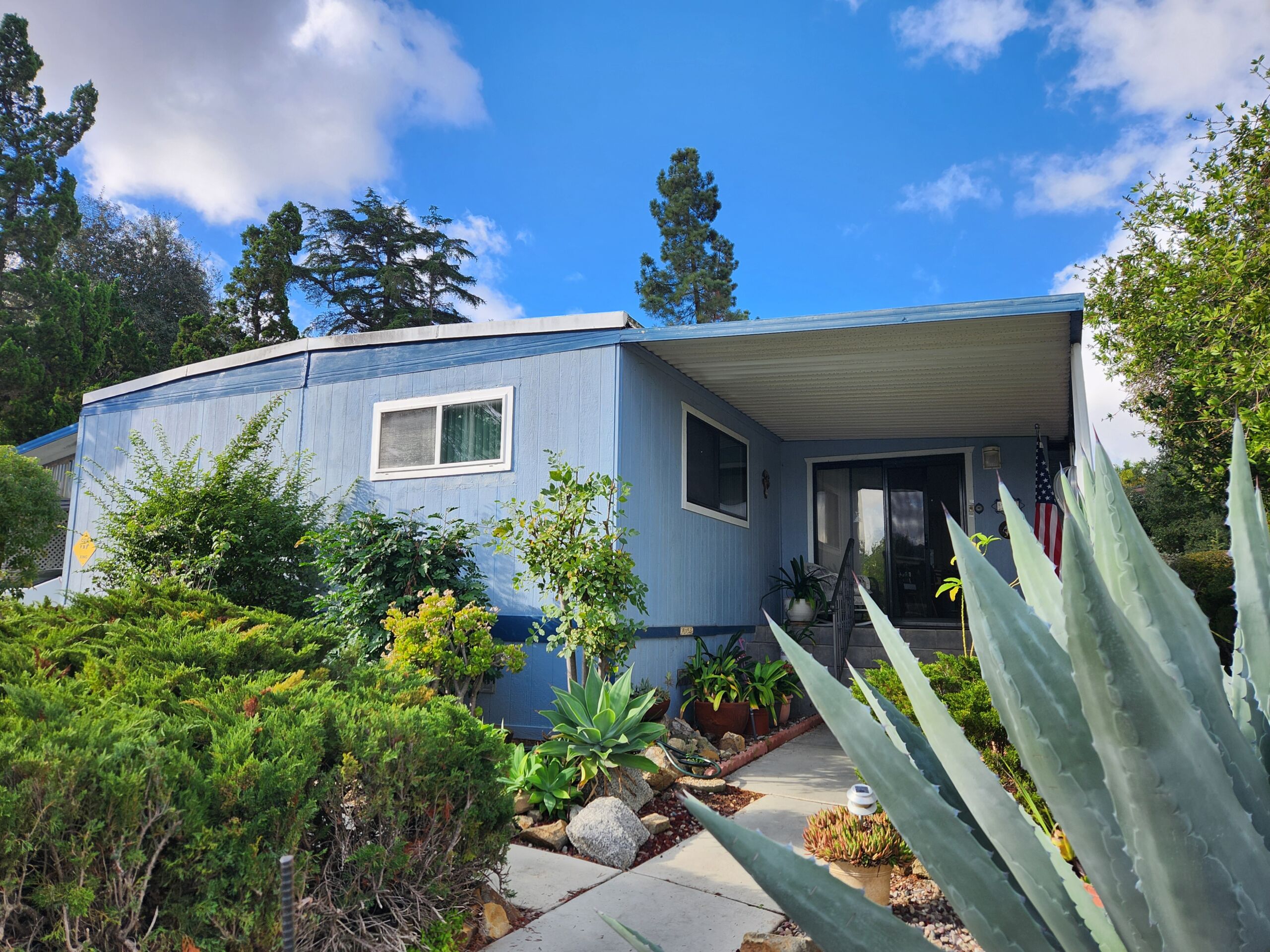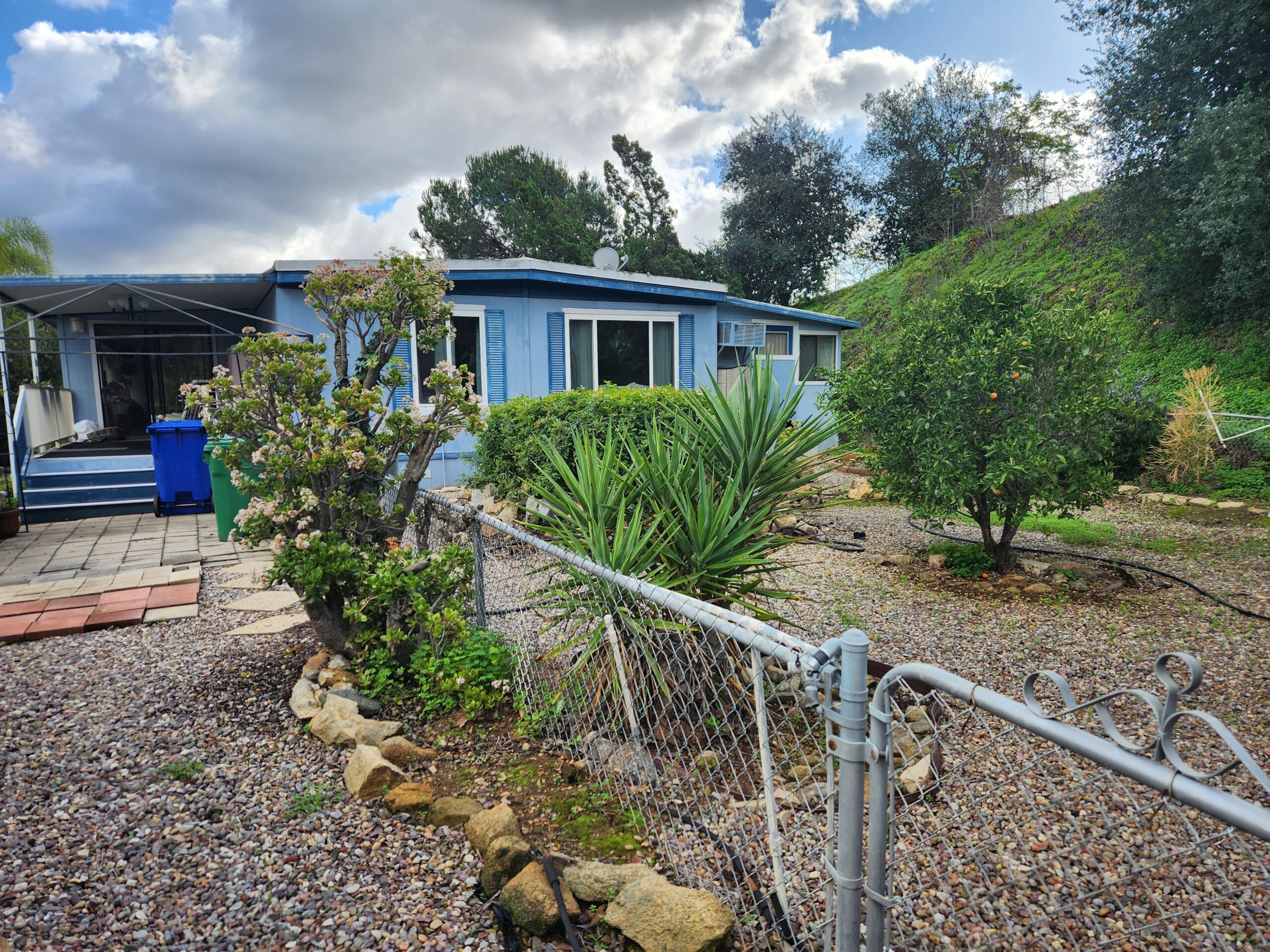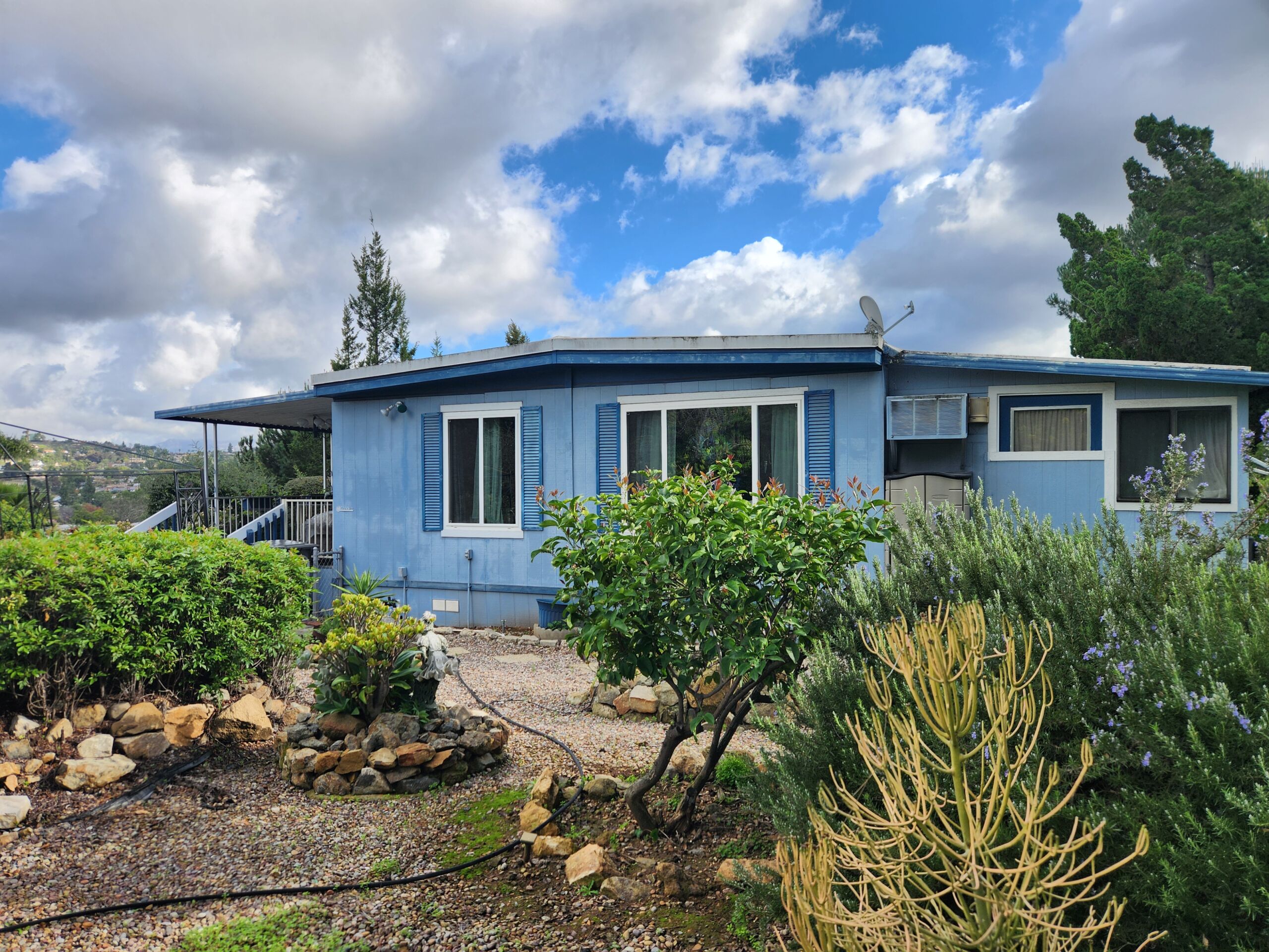 The home’s location is Royal, the Views are expansive, and the Garden is both private and peaceful. Royal View Gardens is one of East County’s most desirable 55+, gated, Resident Owned communities. Sited at the very top of the park is this palatial Goldenwest mobile home with over 1400 sf of living space. The enclosed Calif. room and expanded family room provide an additional 480 sf of added space. One of the largest lots in the park features mature landscaping, fruit trees, a fenced area for a pet, and privacy hedges, all on an automated irrigation system. The spaciously designed kitchen features a 10-foot island with bar seating, double sink, and a stainless-steel Bosch dishwasher. Custom cabinets surround the gas cooktop, stainless steel refrigerator, built in wall oven, matching microwave, and two full height pantries. A wall of windows allows natural light and views to flood this open and inviting space. Just off the kitchen is a covered porch and large patio area. The home features five skylights, a separate laundry with full size washer/dryer, a newer hot water heater, central HVAC, and window AC. The large primary suite offers a ceiling fan, walk-in closet, a bonus closet, and an attached bath with step in shower. Spacious guest bedroom with step-in closet next to the guest bathroom with updated tub/shower. Buy-in $6200, HOA fee is $662.01/month includes access to a sparkling pool, jacuzzi, well-kept grounds, dog park, clubhouse, full kitchen. Home is on annual registration!