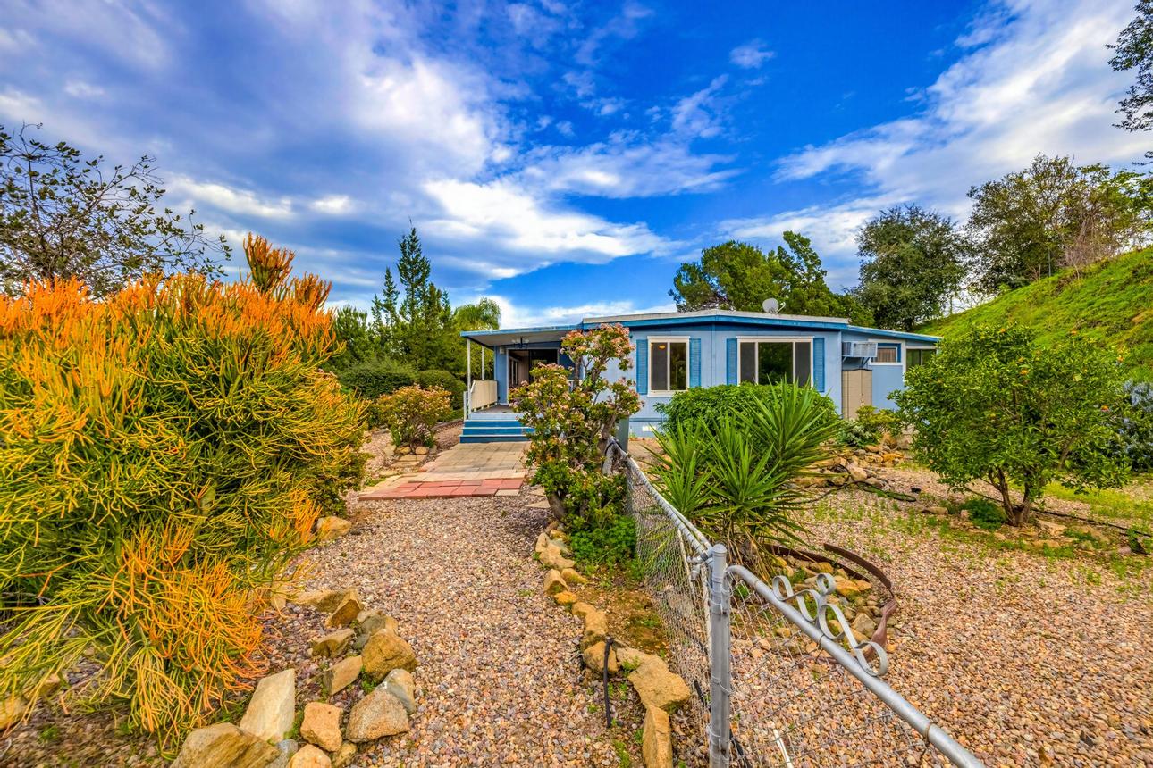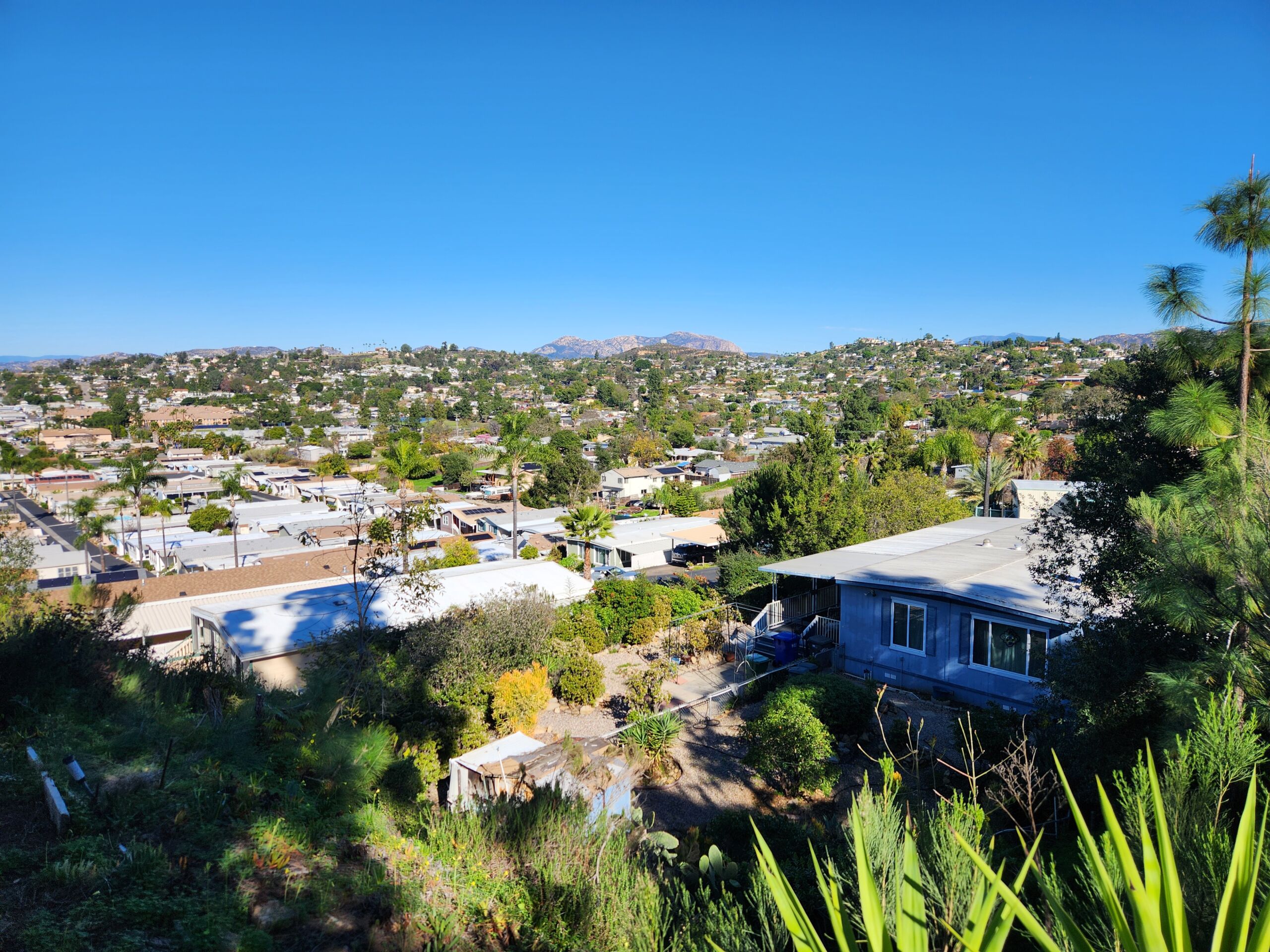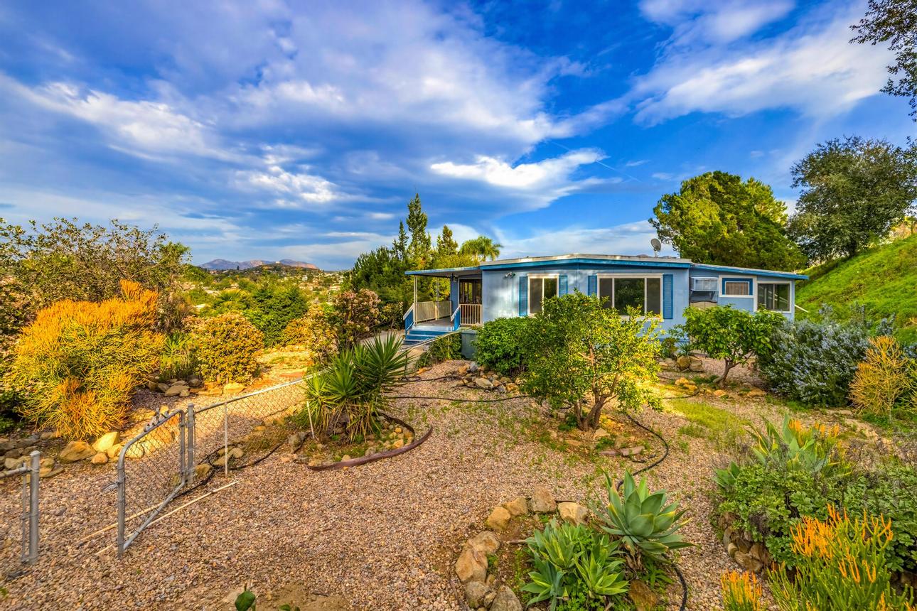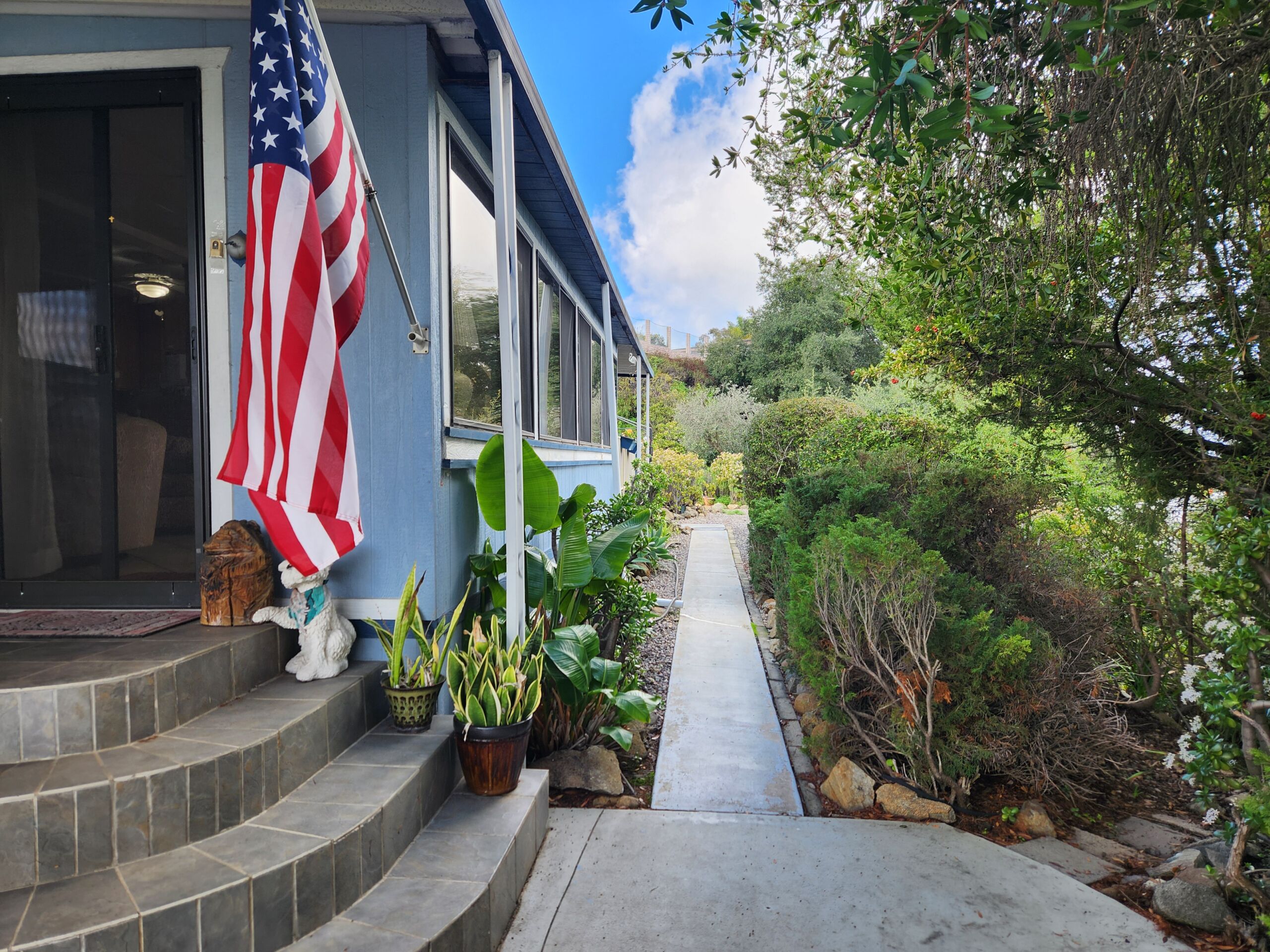 The home’s location is Royal, the Views are expansive, and the Garden is both private and peaceful. Royal View Gardens is one of East County’s most desirable 55+, gated, Resident Owned communities. Sited at the very top of the park is this palatial Goldenwest mobile home with over 1400 sf of living space. The enclosed Calif. room and expanded family room provide an additional 480 sf of added space. One of the largest lots in the park features mature landscaping, fruit trees, a fenced area for a pet, and privacy hedges, all on an automated irrigation system. The spaciously designed kitchen features a 10-foot island with bar seating, double sink, and a stainless-steel Bosch dishwasher. Custom cabinets surround the gas cooktop, stainless steel refrigerator, built in wall oven, matching microwave, and two full height pantries. A wall of windows allows natural light and views to flood this open and inviting space. Just off the kitchen is a covered porch and large patio area. The home features five skylights, a separate laundry with full size washer/dryer, a newer hot water heater, central HVAC, and window AC. The large primary suite offers a ceiling fan, walk-in closet, a bonus closet, and an attached bath with step in shower. Spacious guest bedroom with step-in closet next to the guest bathroom with updated tub/shower. Buy-in $6200, HOA fee is $662.01/month includes access to a sparkling pool, jacuzzi, well-kept grounds, dog park, clubhouse, full kitchen. Home is on annual registration!