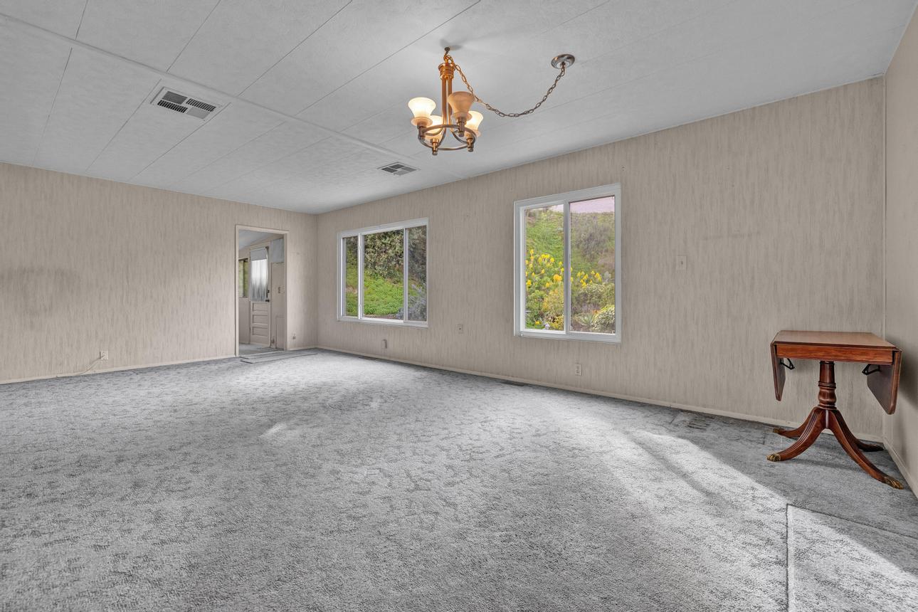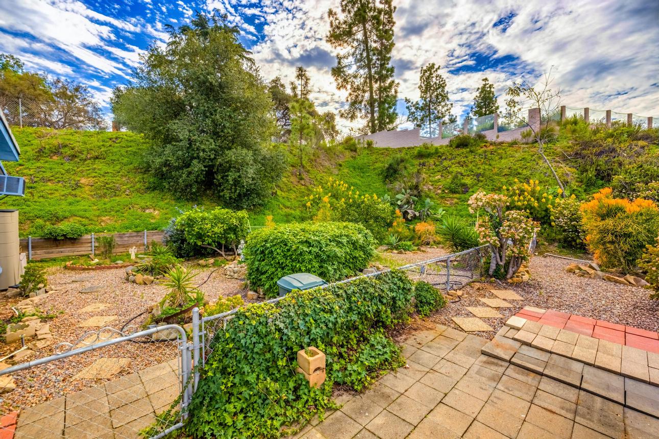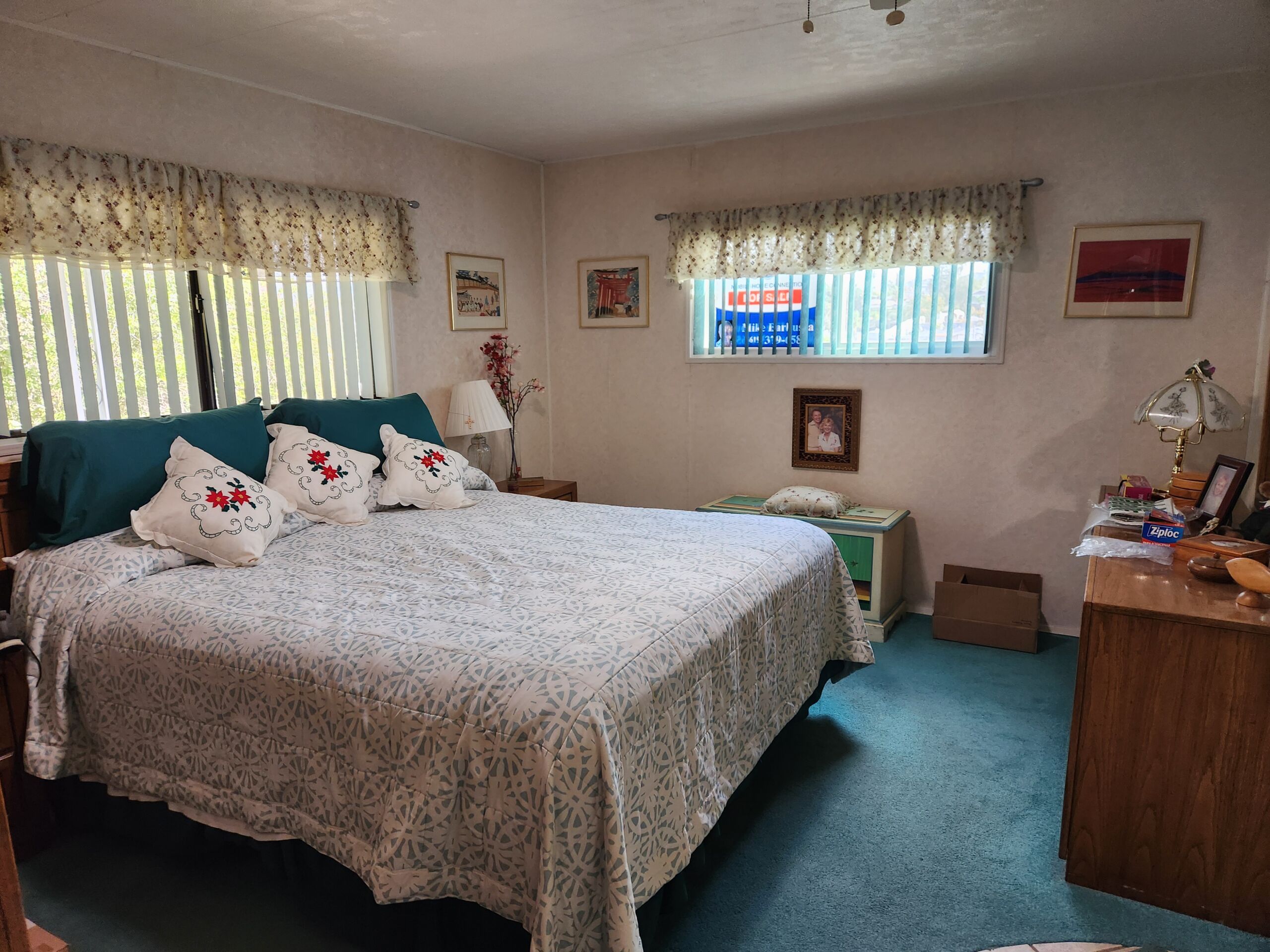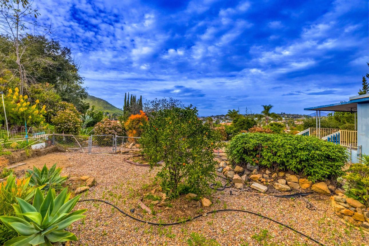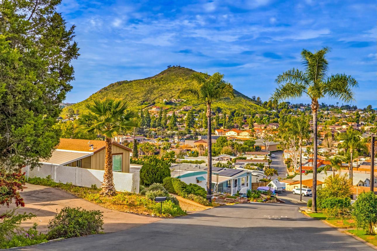 The home’s location is Royal, the Views are expansive, and the Garden is both private and peaceful. Royal View Gardens is one of East County’s most desirable 55+, gated, Resident Owned communities. Sited at the very top of the park is this palatial Goldenwest mobile home with over 1400 sf of living space. The enclosed Calif. room and expanded family room provide an additional 480 sf of added space. One of the largest lots in the park features mature landscaping, fruit trees, a fenced area for a pet, and privacy hedges, all on an automated irrigation system. The spaciously designed kitchen features a 10-foot island with bar seating, double sink, and a stainless-steel Bosch dishwasher. Custom cabinets surround the gas cooktop, stainless steel refrigerator, built in wall oven, matching microwave, and two full height pantries. A wall of windows allows natural light and views to flood this open and inviting space. Just off the kitchen is a covered porch and large patio area. The home features five skylights, a separate laundry with full size washer/dryer, a newer hot water heater, central HVAC, and window AC. The large primary suite offers a ceiling fan, walk-in closet, a bonus closet, and an attached bath with step in shower. Spacious guest bedroom with step-in closet next to the guest bathroom with updated tub/shower. Buy-in $6200, HOA fee is $662.01/month includes access to a sparkling pool, jacuzzi, well-kept grounds, dog park, clubhouse, full kitchen. Home is on annual registration!
