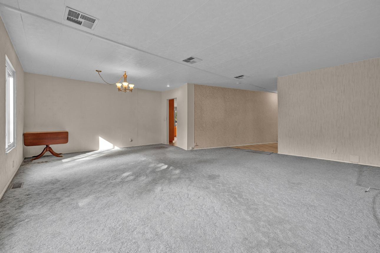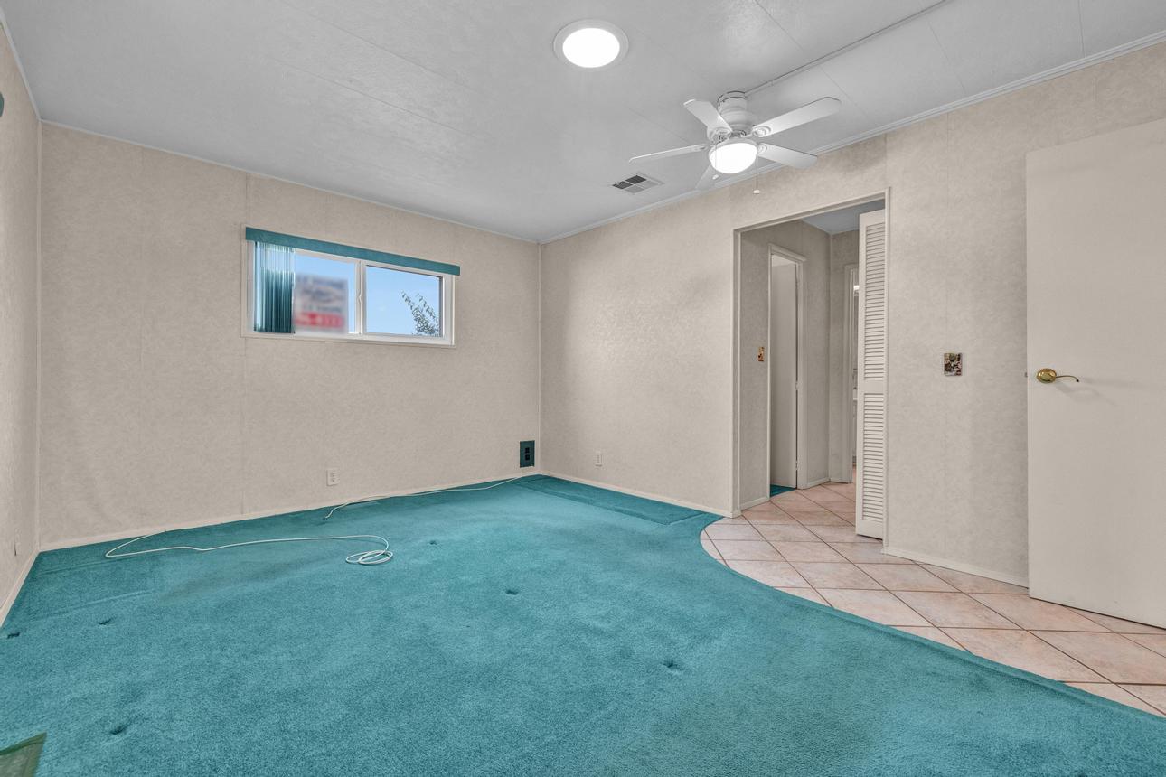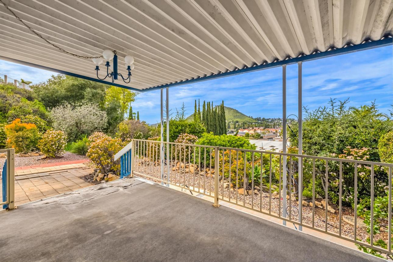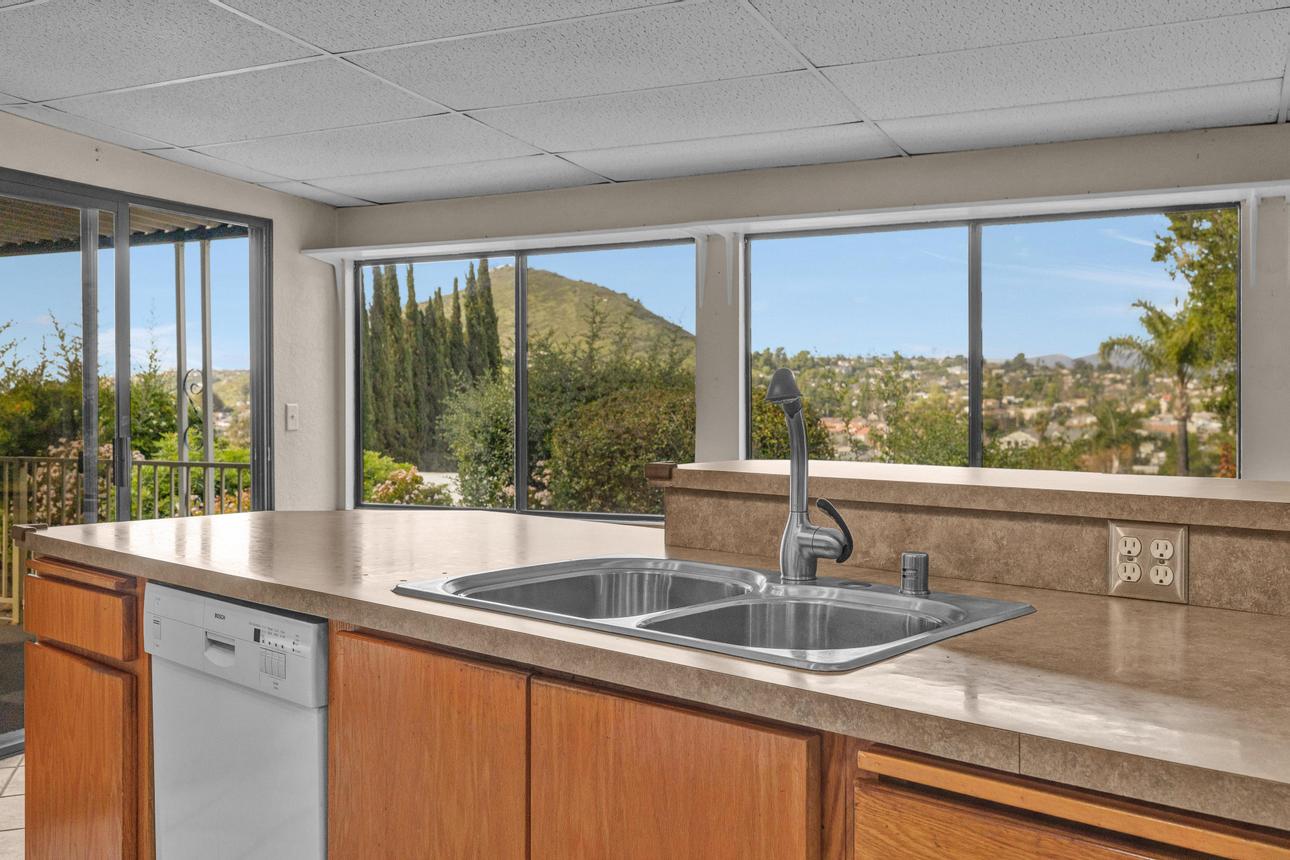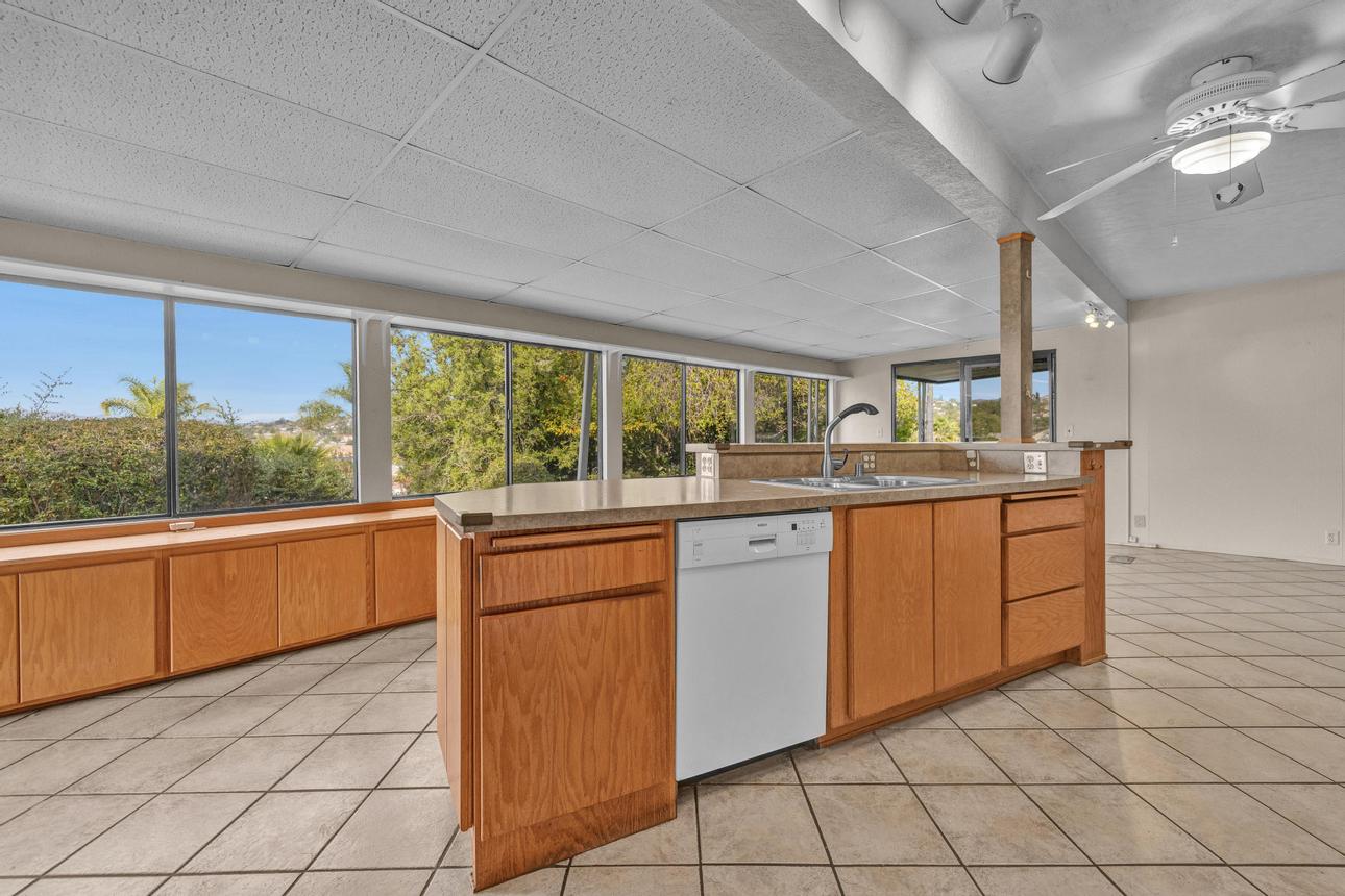 The home’s location is Royal, the Views are expansive, and the Garden is both private and peaceful. Royal View Gardens is one of East County’s most desirable 55+, gated, Resident Owned communities. Sited at the very top of the park is this palatial Goldenwest mobile home with over 1400 sf of living space. The enclosed Calif. room and expanded family room provide an additional 480 sf of added space. One of the largest lots in the park features mature landscaping, fruit trees, a fenced area for a pet, and privacy hedges, all on an automated irrigation system. The spaciously designed kitchen features a 10-foot island with bar seating, double sink, and a stainless-steel Bosch dishwasher. Custom cabinets surround the gas cooktop, stainless steel refrigerator, built in wall oven, matching microwave, and two full height pantries. A wall of windows allows natural light and views to flood this open and inviting space. Just off the kitchen is a covered porch and large patio area. The home features five skylights, a separate laundry with full size washer/dryer, a newer hot water heater, central HVAC, and window AC. The large primary suite offers a ceiling fan, walk-in closet, a bonus closet, and an attached bath with step in shower. Spacious guest bedroom with step-in closet next to the guest bathroom with updated tub/shower. Buy-in $6200, HOA fee is $662.01/month includes access to a sparkling pool, jacuzzi, well-kept grounds, dog park, clubhouse, full kitchen. Home is on annual registration!