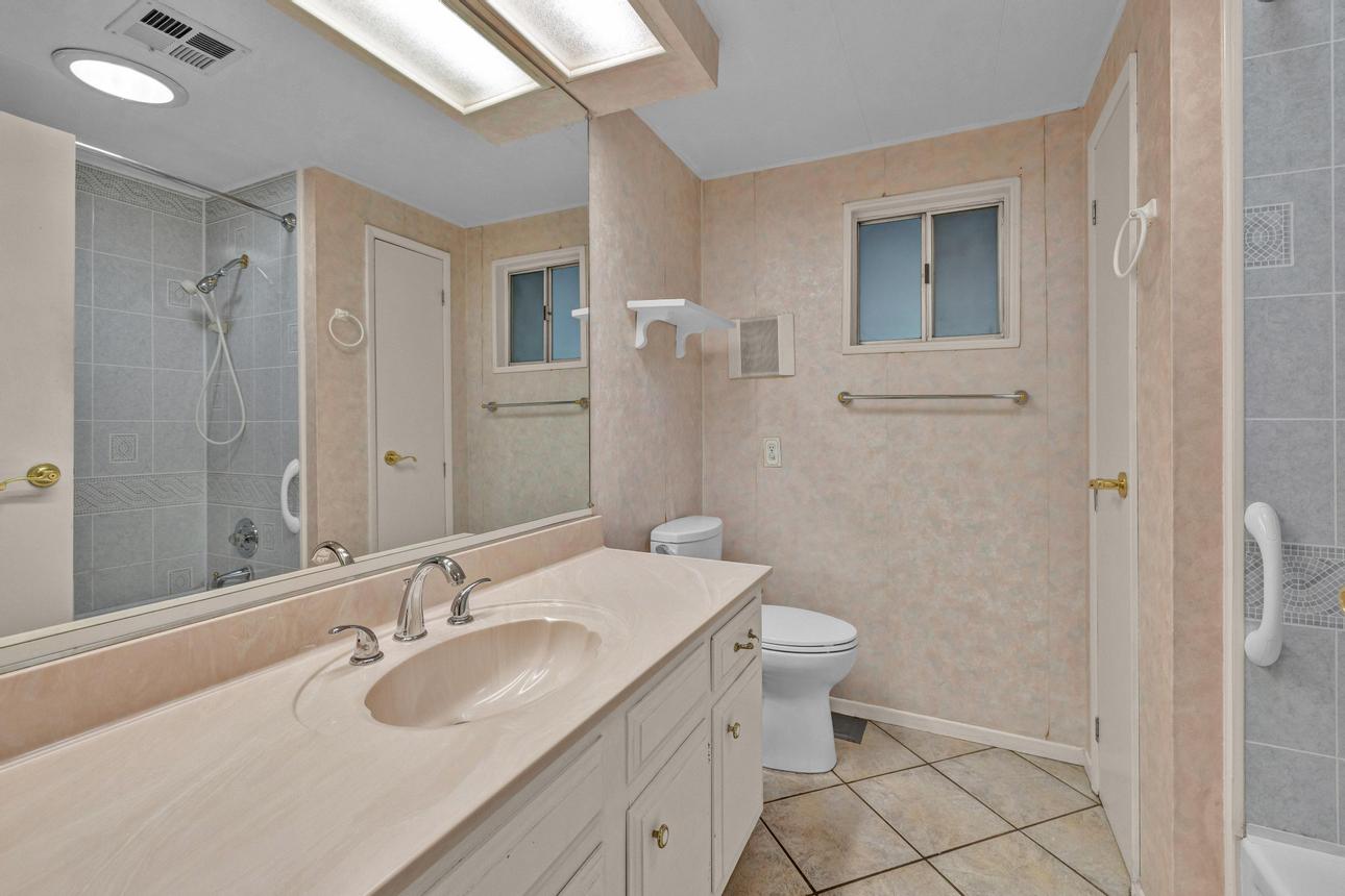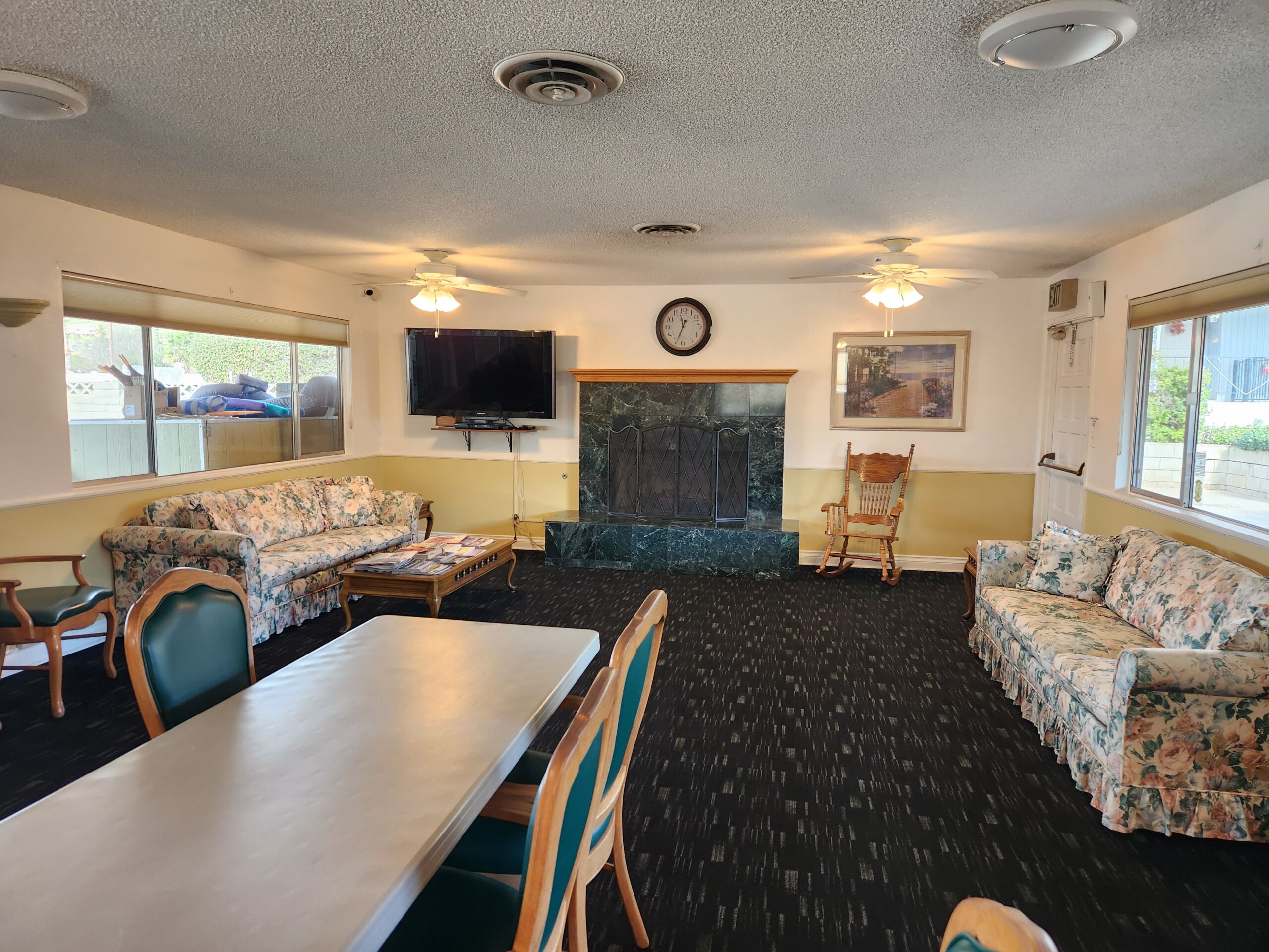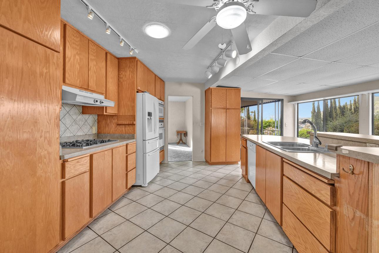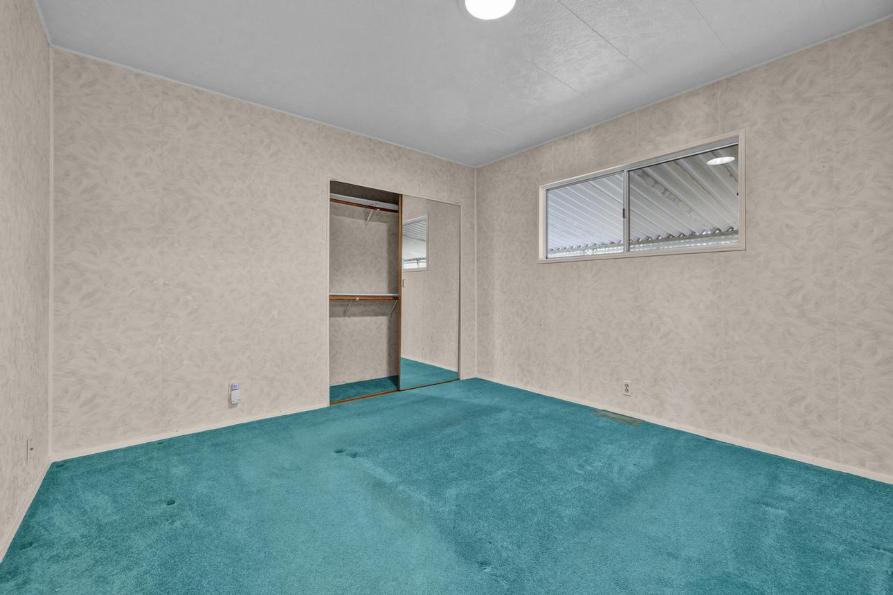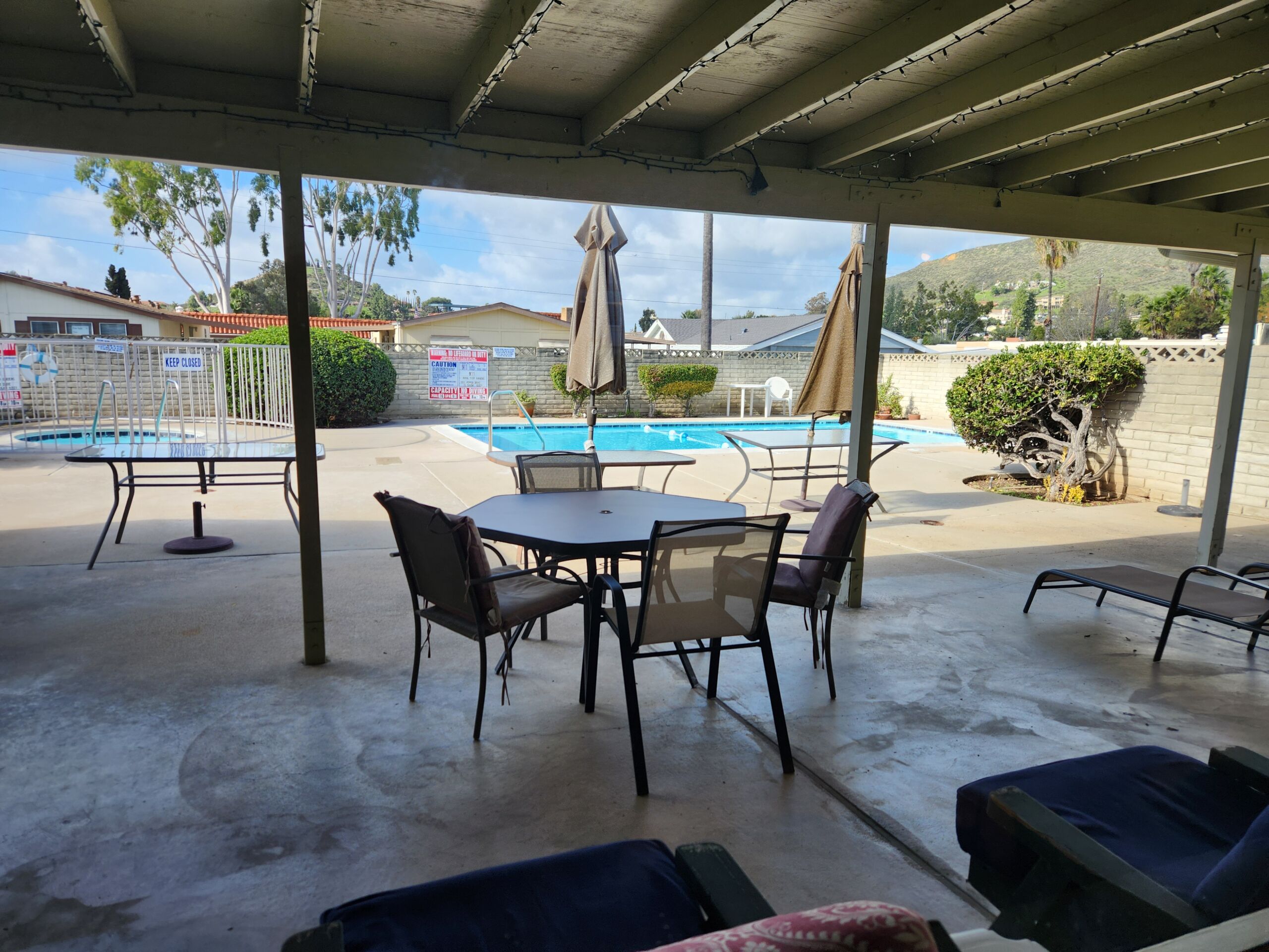 The home’s location is Royal, the Views are expansive, and the Garden is both private and peaceful. Royal View Gardens is one of East County’s most desirable 55+, gated, Resident Owned communities. Sited at the very top of the park is this palatial Goldenwest mobile home with over 1400 sf of living space. The enclosed Calif. room and expanded family room provide an additional 480 sf of added space. One of the largest lots in the park features mature landscaping, fruit trees, a fenced area for a pet, and privacy hedges, all on an automated irrigation system. The spaciously designed kitchen features a 10-foot island with bar seating, double sink, and a stainless-steel Bosch dishwasher. Custom cabinets surround the gas cooktop, stainless steel refrigerator, built in wall oven, matching microwave, and two full height pantries. A wall of windows allows natural light and views to flood this open and inviting space. Just off the kitchen is a covered porch and large patio area. The home features five skylights, a separate laundry with full size washer/dryer, a newer hot water heater, central HVAC, and window AC. The large primary suite offers a ceiling fan, walk-in closet, a bonus closet, and an attached bath with step in shower. Spacious guest bedroom with step-in closet next to the guest bathroom with updated tub/shower. Buy-in $6200, HOA fee is $662.01/month includes access to a sparkling pool, jacuzzi, well-kept grounds, dog park, clubhouse, full kitchen. Home is on annual registration!