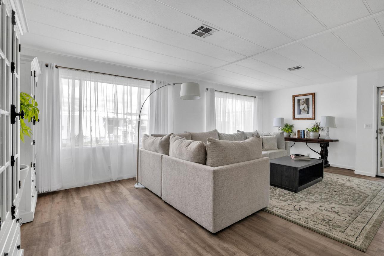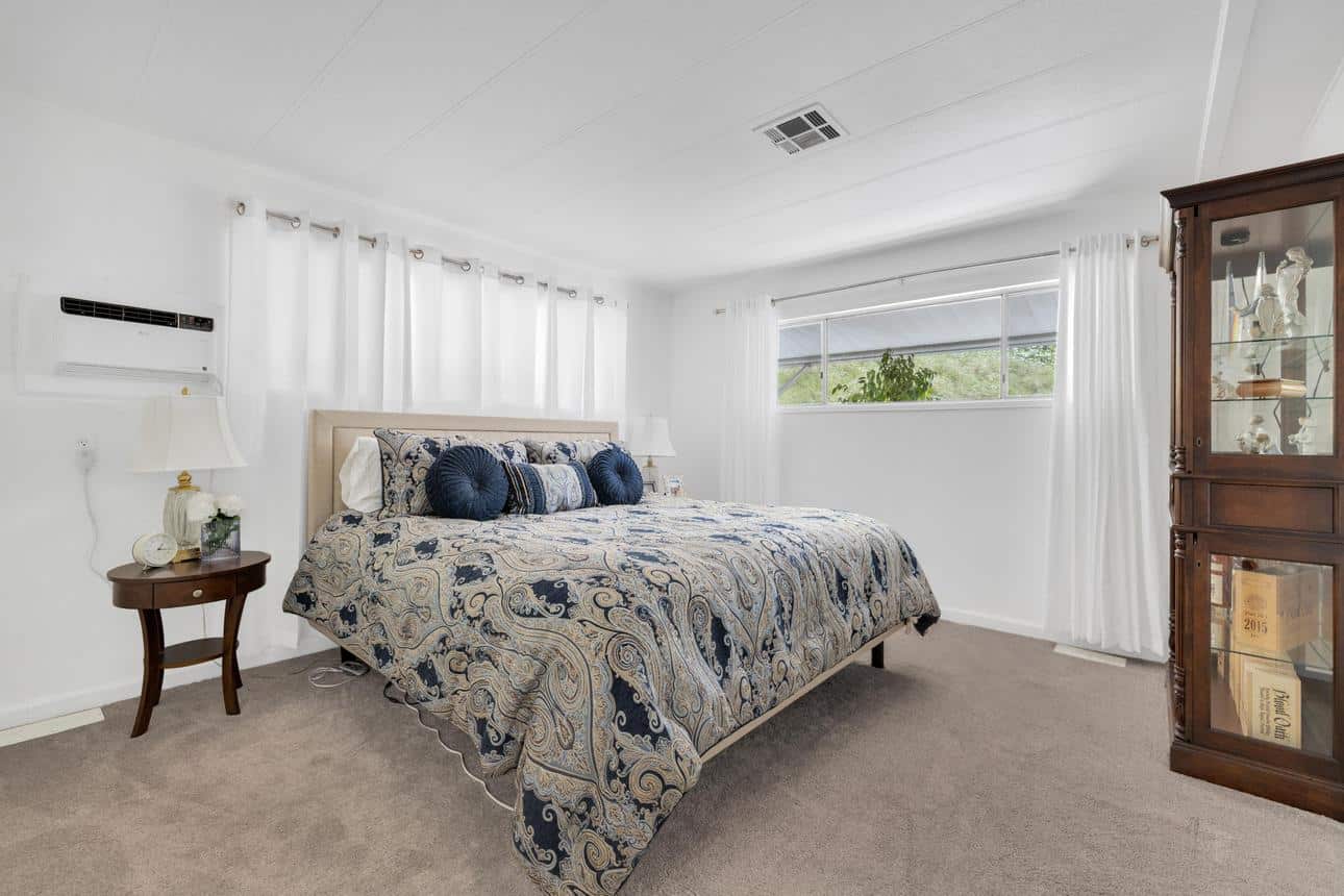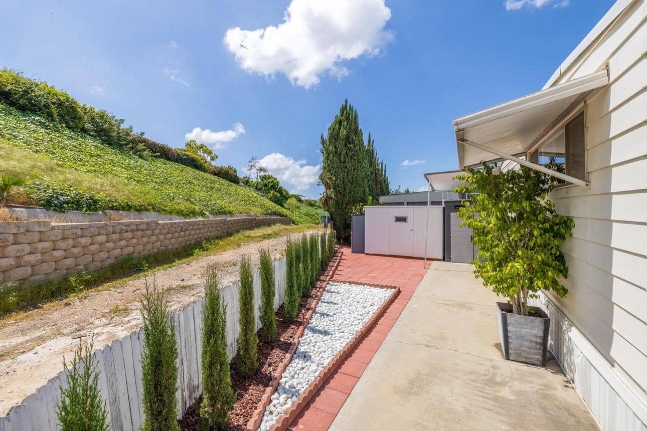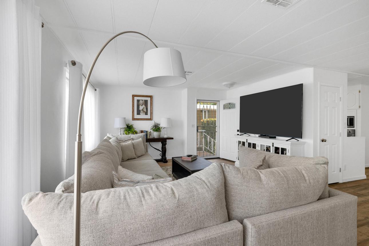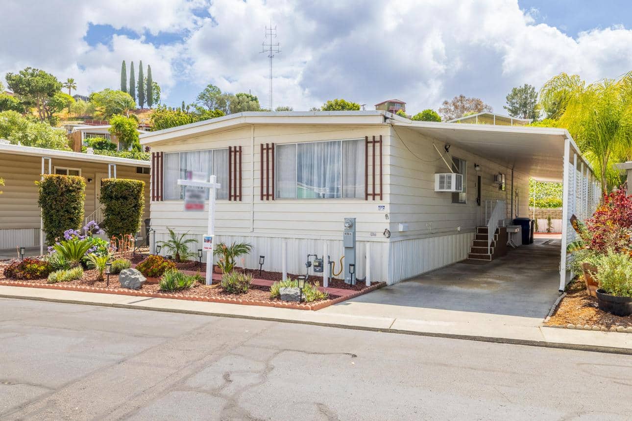 Newly renovated 2-bedroom, 2-bathroom home spans 1,440 sf and features a bonus room that can easily be turned into a private entrance third bedroom. Located in The Cliffs 55+ Mobile Home Park just minutes from Admiral Baker Golf Course, Mission Valley, Downtown San Diego, shopping, dining and health care. Home features a white, crisp, and clean themed move in ready retreat. Dual glazed vinyl windows, window treatments, shutters, new laminate & carpet flooring, and new 6 panel doors. Large living room and dining room are flooded with natural light, kitchen features all new appliances, new counter tops, tiled backsplash, and fresh paint. Both bathrooms are newly remodeled with new plumbing, fixtures, showers, glass doors, mirrors and lighting. Huge primary bedroom with 2 closets, and new carpeting. Three window AC’s to reduce energy costs. Even the yard is newly landscaped with easy care plants! Situated with no neighbors behind you, spacious and fenced rear yard, two sheds, and off street 3 car driveway. (LAZ4890)