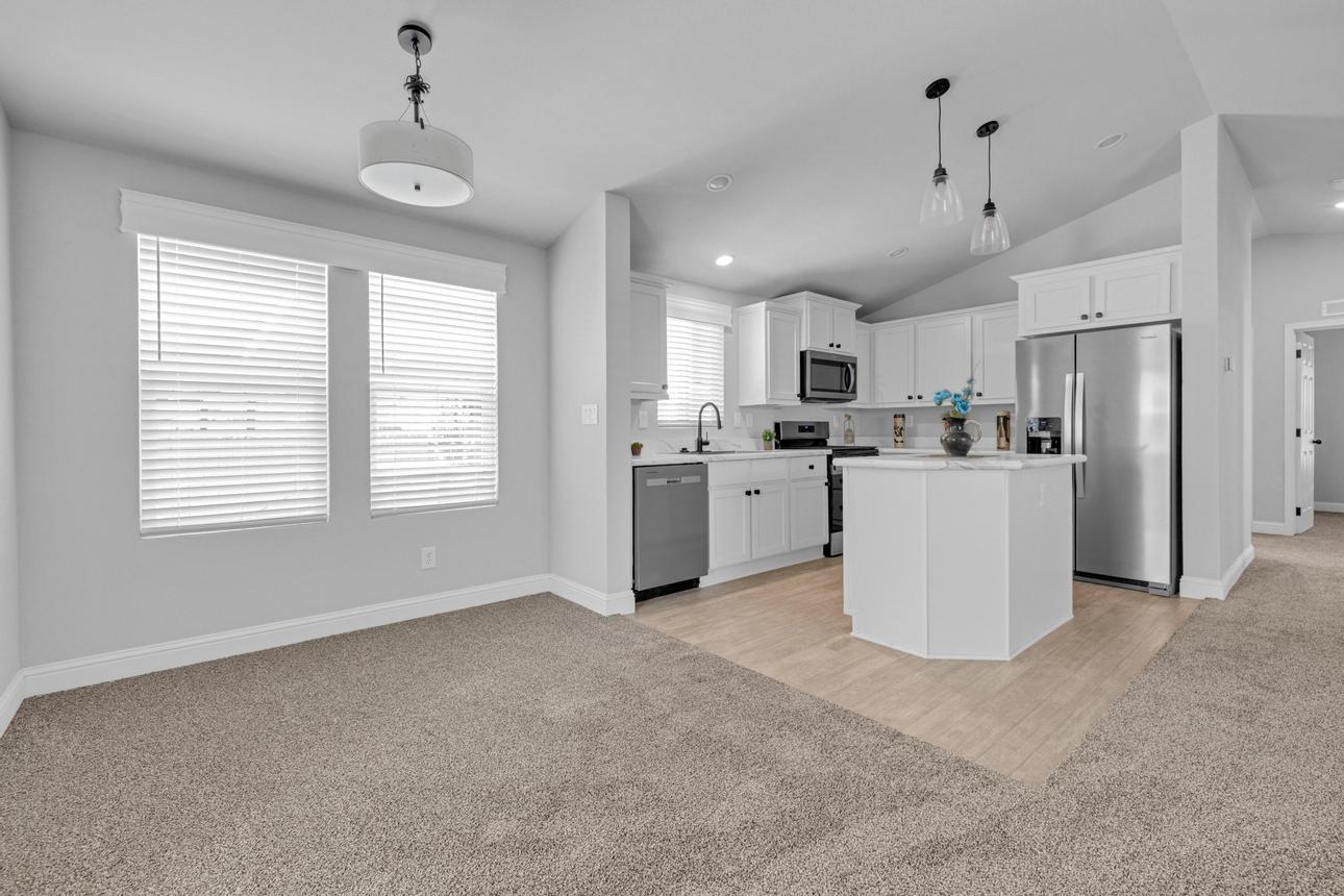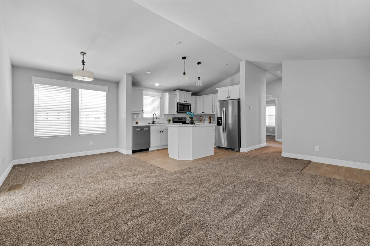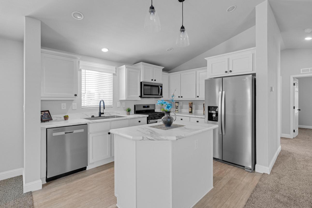 Brand New Manufactured Home! Corner lot in an All Age community. Split concept floor plan, Primary bedroom on one end and the two additional bedrooms on the other, great for privacy. Upgraded stainless appliance package in the kitchen with a built in microwave, dishwasher and side by side refrigerator with a water/ice dispenser. Recessed and pendant lighting, white shaker cabinetry and black hardware. Guest bath has a shower/tub combo. The primary bedroom and ensuite are spacious with plenty of closet space and the bath has a step-in shower. Upgraded window valances and exterior trim. Parking is side-by-side and covered with room for more than two cars. Call today to see this brand new home for yourself!
